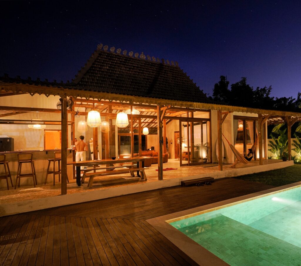 I wanted a place that felt majestic, with high ceilings and generous spaces. A place that respected local traditions, drawing from centuries of Indonesian craftmanship and vernacular architecture designed for tropical living. A house that was social and inviting, where friends and family could gather around a large terrace or share moments through a bar-style kitchen window. A space that was entertaining, with a pool table and a projector for long evenings. And above all, a home that was sustainable, built from natural materials and centered around a salt-water pool.